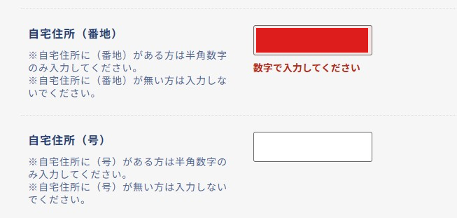例えば、番地が1-2(1番2号)の場合に「1-2」と入力するとエラーになります。